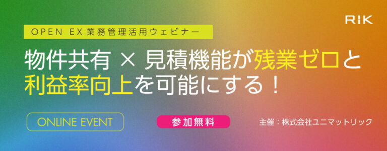 株式会社ユニマットリック(以下、ユニマットリック)は、11月27日(木)14:00~15:00、【物件共有×見積もり機能が残業ゼロと利益率向上を可能にする!】OPEN EX業務管理活用ウェビナー(Zoom配信)を無料開催する。