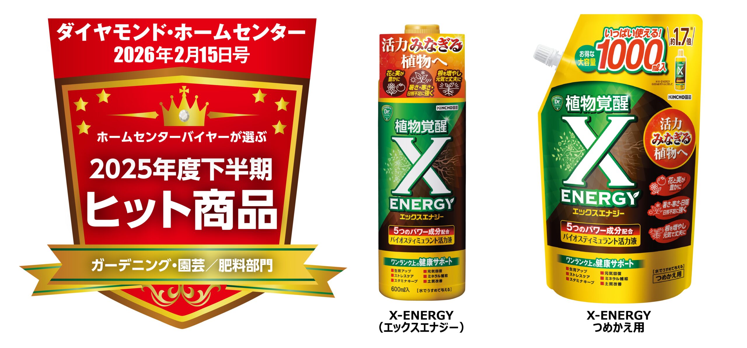 KINCHO園芸株式会社が開発した植物を覚醒させるバイオスティミュラント活力液「X-ENERGY つめかえ用」がダイヤモンド・ホームセンター誌「ホームセンターバイヤーが選ぶ2025年度下半期ヒット商品」に選出・表彰された。