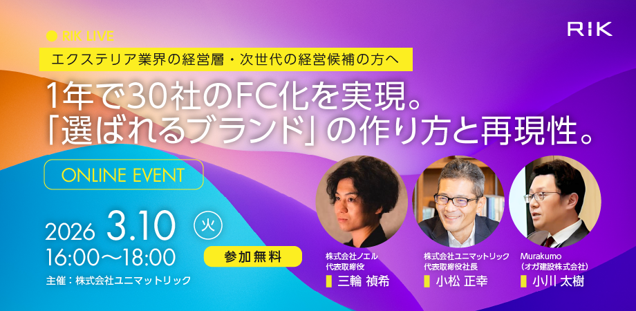 株式会社ユニマットリックは、3月10日(火)16:00~18:00、エクステリア業界の経営層・次世代の経営候補者向けにオンラインセミナー RIK LIVE『1年で30社のFC化を実現。「選ばれるブランド」の作り方と再現性。』をオンラインにて無料開催する。