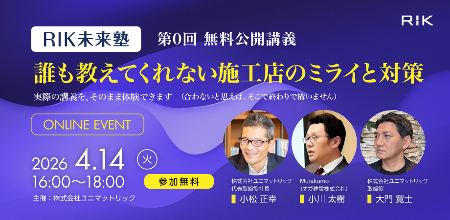 株式会社ユニマットリックは、4月14日(火)16:00~18:00、エクステリア業界の経営者・後継者・次世代リーダーの人を対象に【経営者向けオンラインセミナー】誰も教えてくれない施工店のミライと対策 RIK未来塾 第0回無料公開講義を、オンライン(Zoom)にて開催する。